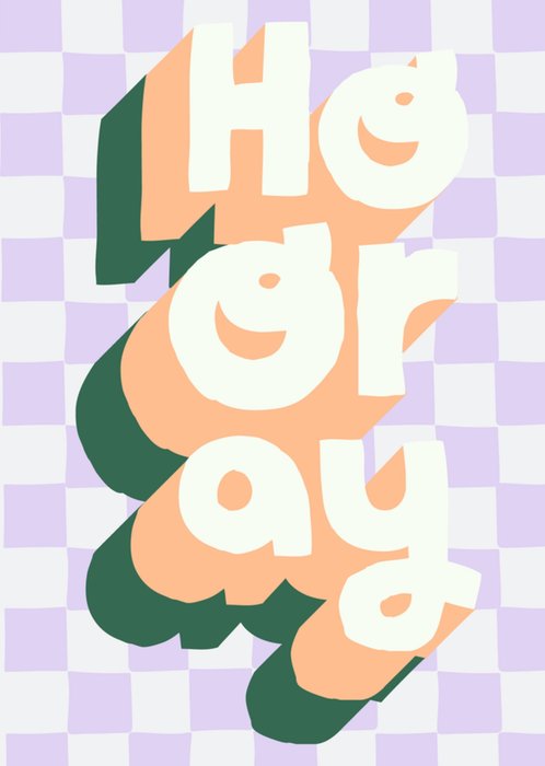 Front of card: Featuring bold white 3D typographic lettering with deep green & orange drop shadow, stacked vertically, on a lilac and white chequered background.