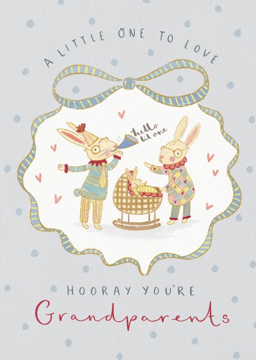 A modern design featuring two pastel illustrated rabbits standing beside a baby rabbit in a wicker crib, with tiny hearts and a striped bow frame on a grey & blue spot background.