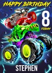 The greeting card features two vibrant monster trucks in an action-packed, high-energy scene with electric lightning effects. One truck has a green dragon-like design, while the other is chrome and red. The text at the top reads “Happy Birthday” in bold yellow letters, and “8 Today” is prominently displayed on the right. At the bottom, there is white text against a dark blue background.