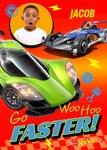 Featuring one bold circular photo upload frame, dynamic blue and green racing cars, yellow lightning bolts, racing icons and the Hot Wheels logo at the bottom on a bright red and orange checked background.