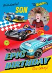 Featuring a circular photo upload frame, three colourful racing cars, chequered racing flags, speedometer and racing icons, and large typographic lettering on a vibrant blue, red, pink and yellow background.