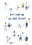 A charming Easter card featuring a playful mix of illustrated people holding eggs and celebrating a festive egg hunt.