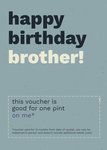 Text reads: "Happy Birthday brother! This voucher is good for one pint on me* * *Voucher valid for 12 months from date of receipt, can on be redeemed in person and doesn't include additional kebab costs."