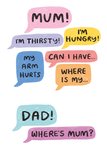 A humorous illustrated card featuring colourful speech bubbles filled with classic kids' requests to their parents.