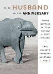 Front of card: Large photograph of an elephant taking up the left hand side of the card. Editable Anniversary message at the top and humorous message to the right in black typewriter type. Text reads:"To my Husband on our anniversary. Being married is like having a BEST FRIEND (Who doesn’t remember anything I say!)" With customisable husband.