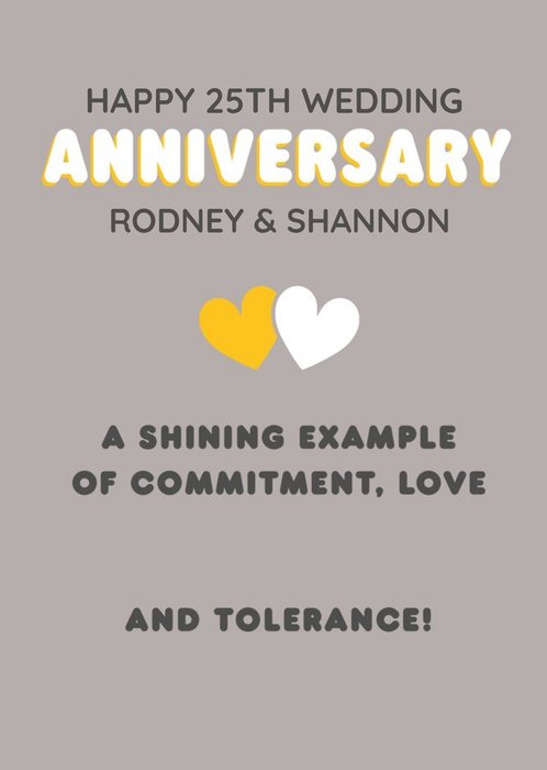 Two small overlapping hearts, one yellow, one white, in the centre with humorous anniversary message above and below in dark grey type. Large ‘Anniversary’ in white and yellow with editable names and ‘Happy 25th Wedding’.