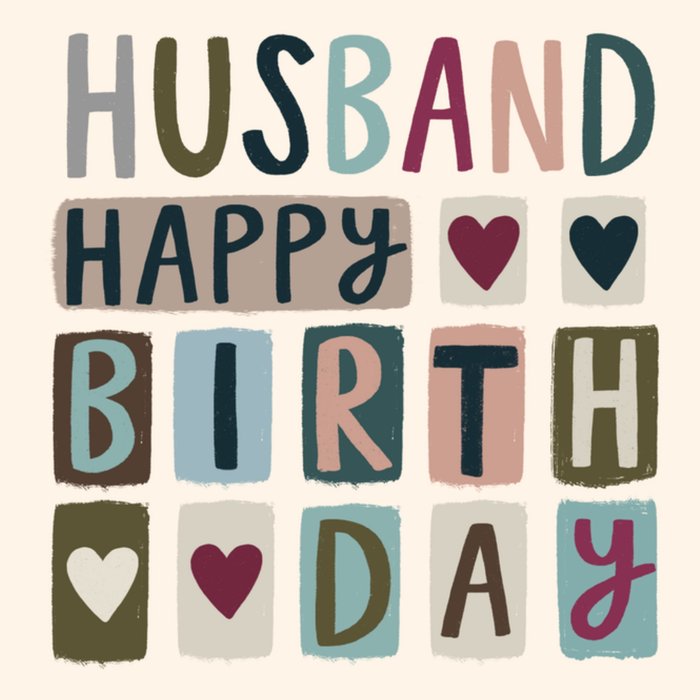 A colourful, modern birthday card featuring hand lettered text arranged in painterly blocks on a warm cream background.