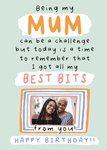 Front of card: Featuring handwritten typography with a colourful photo frame. Text reads: "Being my mum can be a challenge but today is a time to remember I got my best bits from you! Happy birthday!".