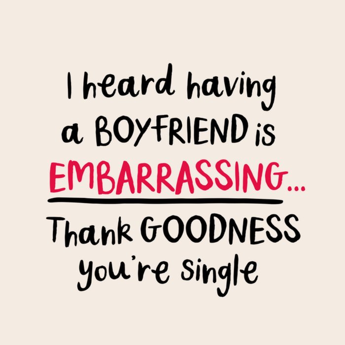 Featuring bold black handwritten text with the word “Embarrassing” highlighted in bright pink on a light cream background. The playful design delivers a cheeky message perfect for a single friend.