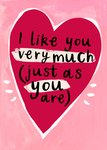 A heartfelt card featuring a large red heart on a pink background with hand-drawn text.