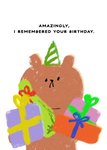 A quirky illustrated card featuring a slightly bewildered bear in a party hat holding a stack of colourful presents. A fun and humorous way to acknowledge a birthday – just in time!