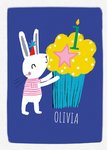 Front of card: A cute & colourful design featuring an illustration of a rabbit holding a cupcake with a numbered candle on top. Underneath the cupcake is space for an editable name. The design sits on a blue background with a textured white edge.