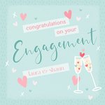 Abstract pattern on turquoise background with illustratino of two champagne glasses surrounded by small hearts