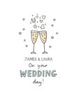 Jenny Seddon Illustrated Champagne glasses with confetti and stars, on a white background. The caption reads Editable Names On Your Wedding Day! The rear of the card has the Jenny Seddon and Moonpig logos