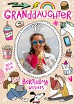 Features multiple illustrations of female characters, a cat, dog, unicorn. And food items such as a burger, popcorn, cake, doughnut and slushy. In the centre of the card is a large photo upload frame with a white, scalloped border.
