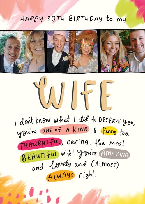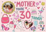 Features lots of brightly coloured illustrations of cakes, flowers, a handbag, shoes, lipstick and cocktails on a pink background. There are two photo uploads. One in the shape of a heart and the other circular with flower petals around it.