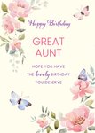 Front of Card: Illustrated butterflies and flowers on a cream background with purple and pink text in center. Card reads:"Happy Birthday Great Aunt. Hope you have the lovely birthday you deserve." With editable name.