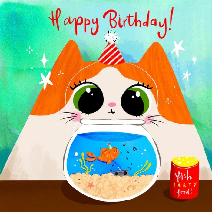 Cute illustration of a wide eyed cat in a party hat staring at a fish dancing to music inside a fish bowl.