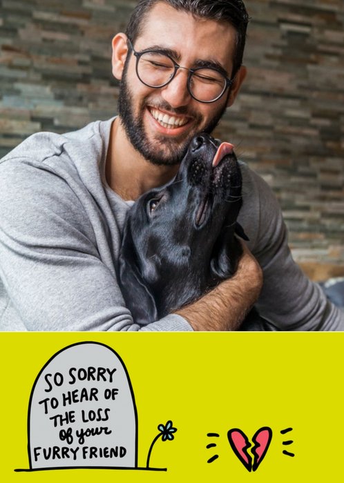 Front of card: Features a large, circular photo upload frame in the centre of the card which is surrounded by illustrations of colourful flowers and butterflies. The design is on a yellow background. Text reads: "Sorry Vanessa". Name can be customised.