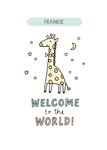 Jenny Seddon Illustrated giraffe surrounded by the moon and stars, on a white background. The caption reads Editable Name Welcome To The World!