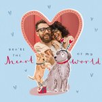 Featuring an illustration of two cute dogs. Behind them is a large, pink, heart shaped photo upload frame, surrounded by small hand-drawn hearts on a light blue background.