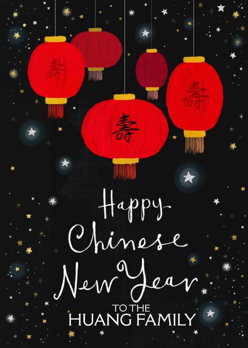 Front of card: Illustration of red lanterns on black starry background with white text below. Text reads: "Happy Chinese New Year to the Huang Family" With editable text option