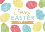 Front of card: Illustrated multicoloured easter eggs on a white background, surrounding text in the middle that reads: "Happy Easter Sophie". "Sophie" is editable.