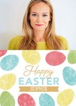 Front of card: Illustrated multicoloured easter eggs on a white background, surrounding text that reads: "Happy Easter Sophie". The top half of the card contains a photo upload frame. "Sophie" is editable.