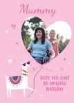 Front of Card: Love heart shaped photo upload with llama on a pink background Card reads:"Mummy. Hope you have an amazing birthday" Editable text: Mummy
