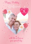 Front of Card: Heart photo framed by roses on a pink background and pink heart with age. Card reads:"Happy Birthday Girlfriend. 50 with lots of love on your special day." With editable text options.