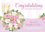Front of card: Illustration of pink and white rose bouquet with two glasses of champagne on pink and white background. Text reads: "Congratulations on your wedding Son and Daughter-in-Law. Wishing you every happiness on your special day With customisable text.