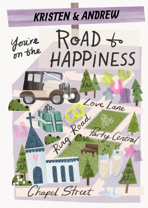 Featuring a whimsical illustrated road map with a chapel, wedding car, gift box, champagne flutes, trees and wedding rings on a multicolour background