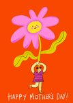 Front of card: Mother's Day Card Illustration of a character holding up a giant flower on a vibrant orange background. Text reads: "Happy Mother's Day!".