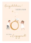 Front of card: On Your Engagement Card Illustration of a couple either side of a giant engagement ring. Text reads: "Congratulations Lizzie & Joe on your engagement!". 'Lizzie & Joe' can be personalised!