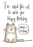 Front of card: 'What's a Birthday?' Humourous Birthday Card Illustration of a cute cat. Text reads: "I've asked this cat to wish you happy Birthday" and "whats' a Birthday?".