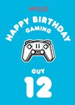 Front of card: 12th Birthday Card Illustration of a game controller with bold typography on a blue background. Text reads: "Mylo happy birthday gaming guy 12". 'Mylo' can be personalised!