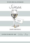 "To my special Husband Simon 70 today", "happy birthday" and "in wine years you are extra fine. 'To my special Husband Simon 70', 'happy birthday' and 'in wine years you are extra fine' can be personalised!