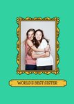 Front of card: 'World's Best Sister' Photo Upload Card Illustration of a gold picture frame on a green background. Text reads: "World's best Sister". All text can be personalised!