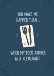Front of card: Humorous Anniversary Card Illustration of a knife and fork on a blue background. Text reads: "You make me happier than... when my food arrives at a restaurant".