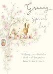 Front of card: Grandma's Birthday Card Cute illustration of a mouse and a rabbit sitting in a tree with tea and cupcakes on a cream background. Text reads: "Granny It's your special day!" and "Wishing you a Birthday filled with happiness love from Jenny x". 'Wishing you a Birthday filled with happiness love from Jenny x' can be personalised!