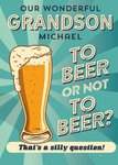 Front of card: Grandson's Birthday Card Illustration of a pint of beer. Text reads: "Our wonderful grandson Michael to beer or not to beer? That's a silly question!". 'Michael' can be personalised!