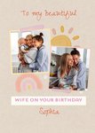Front of card: 'To my beautiful Wife' Photo Upload Birthday Card Illustration of a rainbow and the sun with photo frames. Text reads: "To my beautiful wife on your birthday Sophia". All text can be personalised!