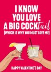 Front of card: 'You love a big...' Funny Valentine's Day Card Illustration of a toast with cocktails on a red background. Text reads: "I know you love a big cocktail (which is why you must love me)" and "Happy Valentine's Day".