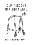 Front of card: Old Person's Birthday Card Illustration of a walking frame. Text reads: "Old person's birthday card. (happy birthday Dave)". '(happy birthday Dave) can be personalised!