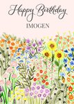Front of card: Birthday Card Illustration of a wild flower meadow on a cream background. Text reads: "Happy Birthday Imogen". 'Imogen' can be personalised!