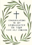 Front of card: Goddaughter's First Holy Communion Card Illustration of an olive wreath and a Christian cross on a cream background. Text reads: "Congratulations to my Goddaughter on your first Holy Communion".