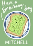 Front of card: Smashing Birthday Card Illustration of avocado on toast on a green background. Text reads: "Have a smashing day Mitchell". 'Mitchell' can be personalised!