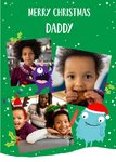 Front of card: Photo Upload Christmas Card Illustration of cute and colourful monsters with three photo frames on a green background. Text reads: "Merry Christmas Daddy". All text can be personalised!