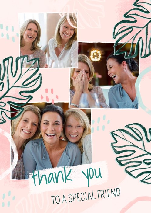 Front of card: Thank You Photo Upload Card Illustration of flowers surround a photo frame on a light green polka dot background. Text reads: "Thank you Nan" and "Lots of love from Hayley". 'Nan' and 'Lots of love from Hayley' can be personalised!