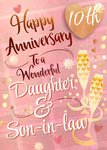 Front of card: Daughter & Son-in-law Anniversary Card Illustration of glasses of wine surrounded by hearts on a pink background. Text reads: "Happy 10th Anniversary to a wonderful Daughter & Son-in-law". '10th' , 'Daughter' and 'Son-in-law' can be personalised!
